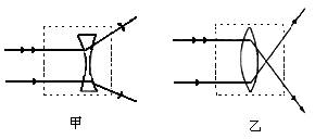 请在下图(甲)、(乙)的虚线框内分别画一个适当的光学器件,使它满足图中改变光路的要求.