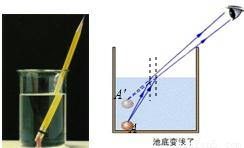 将一支铅笔斜插入水中,从侧面斜视水面,会发现什么现象?在空的茶杯里放一枚硬币,移动杯子,使眼睛刚刚看不到硬币,保持眼睛和杯子的位置不变,慢慢地向杯里倒水,随着水面的升高,观察会发生什么现象?