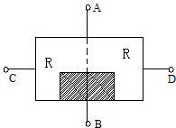 如图所示为一块电阻均匀的矩形薄金属片,长是宽的2倍,现以长边的中点AB为轴线,挖去阴影部分,则AB间的电阻与CD间的电阻之比是多少?