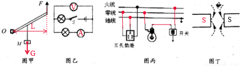 (1)在图甲中作出物体M所受重力的示意图,并作出以O为支点,动力F的力臂L.(2)如图乙,在圆圈内填入正确的电表符号,使开关闭合后两灯都能发光.