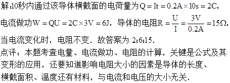 加在某导体两端的电压为3伏,通过它的电流为0.2安,则10秒内通过该导体横截面的电量为______库,电流做功为______焦。当通过该导体的电流为0.5安时,它的电阻为_____欧。