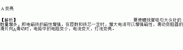 小芳用漆包线在笔杆上绕制了一只螺线管,接入如图所示电路中.闭合开关S后,要使螺线管吸引大头针的数量增多,变阻器的滑片P应向_________(填“A”或“B”)端滑动,此时灯泡_________(填“变亮”“变暗”或“不变”).