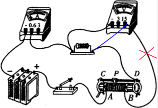 在研究电压变化对电流的影响的实验中,某同学连接的电路,如图所示.但在电路中有一根导线接错了,请你用笔在图中将接错的导线打上“×”,把正确的接线画上.