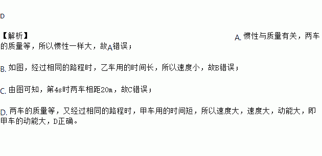 D ¡¾½âÎö¡¿A. ¹ßÐÔÓëÖÊÁ¿Óйأ¬Á½³µµÄÖÊÁ¿µÈ£¬ËùÒÔ¹ßÐÔÒ»Ñù´ó£¬¹ÊA´íÎó£» B. Èçͼ£¬¾¹ýÏàͬµÄ·³Ìʱ£¬ÒÒ³µÓõÄʱ¼ä³¤£¬ËùÒÔËÙ¶ÈС£¬¹ÊB´íÎó£» C. ÓÉͼ¿ÉÖª£¬µÚ4sʱÁ½³µÏà¾à20m£¬¹ÊC´íÎó£» D. Á½³µµÄÖÊÁ¿µÈ£¬ÓÖ¾¹ýÏàͬµÄ·³Ìʱ£¬¼×³µÓõÄʱ¼ä¶Ì£¬ËùÒÔËÙ¶È´ó£¬Ëٶȴ󣬶¯Äܴ󣬼´¼×³µµÄ¶¯ÄÜ´ó£¬DÕýÈ·¡£