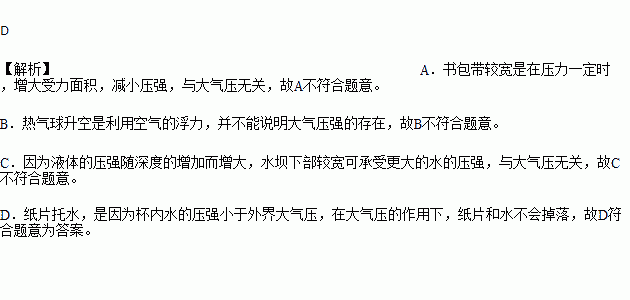 A. 书包带较宽 B. 热气球升空 C. 水坝下部较宽 D. 纸片托水
