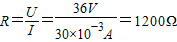 点评:利用欧姆定律求解,注意单位换算:1mA=10-3A