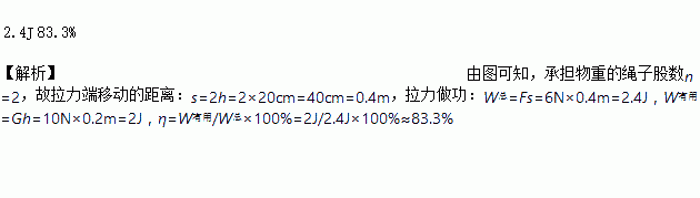 如图所示,用动滑轮将重为10N的物块竖直向上匀速提升20cm,拉力为6N,此过程中拉力做的功为____J,动滑轮的机械效率为____。