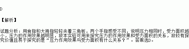 D 【解析】 试题分析:用食指和大拇指轻轻夹着三角板,两个手指感受不同,说明压力相同时,受力面积越小,压力的作用效果越明显,故本实验可用来探究压力的作用效果和受力面积的关系,故较有探究价值且易于探究的是“压力作用效果与受力面积有什么关系?”。答案选D。