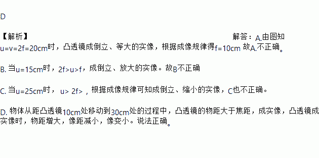D ¡¾½âÎö¡¿½â´ð£ºA.ÓÉͼ֪u=v=2f=20cmʱ£¬Í¹Í¸¾µ³Éµ¹Á¢¡¢µÈ´óµÄʵÏñ£¬¸ù¾Ý³ÉÏñ¹æÂɵÃf=10cm ¹ÊA.²»ÕýÈ·¡£ B. µ±u=15cmʱ£¬2f>u>f£¬³Éµ¹Á¢¡¢·Å´óµÄʵÏñ¡£¹ÊB²»ÕýÈ· C. µ±u=25cmʱ£¬ u> 2f>£¬¸ù¾Ý³ÉÏñ¹æÂÉ¿ÉÖª³Éµ¹Á¢¡¢ËõСµÄʵÏñ£¬CÒ²²»ÕýÈ·¡£ D. ÎïÌå´Ó¾à͹͸¾µ10cm´¦Òƶ¯µ½30cm´¦µÄ¹ý³ÌÖУ¬Í¹Í¸¾µµÄÎï¾à´óÓÚ½¹¾à£¬³ÉʵÏñ£¬Í¹Í¸¾µ...
