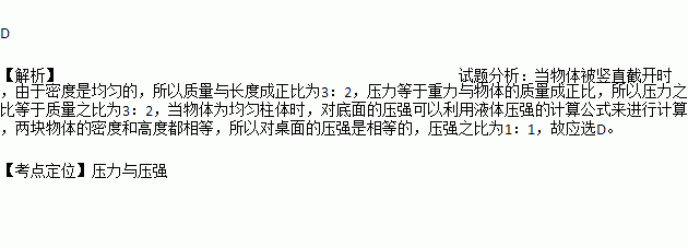 有一个密度均匀的长方体铜块,被截成A、B两块,如图所示。已知LA:LB=3:2,则它们对水平桌面的压力和压强之比分别为( )
