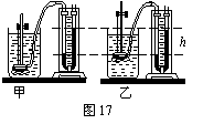 小强同学在探究液体压强关系时,将同一压强计的金属盒先后放入甲、乙两种液体中,看到的现象如图17所示,在这个实验中,他是控制这两种液体对金属盒的________相同,从这个实验可以比较出两种液体密度的大小关系是ρ甲 _______ρ乙。(填:“大于”、“小于”或“等于”)