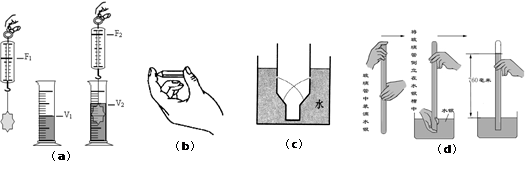 如图所示为活动卡上的几个实验。①如图(a)所示实验过程是定量研究浸没在液体中的物体受到的浮力与 (4) 之间的关系,量筒中盛放的是水,物体受到的浮力可以用 (5) 表示,V2-V1表示 (6) 。②如图(b)所示,在探究压力的作用效果与哪些因素有关时,将铅笔压在大拇指和食指之间,观察到手指肌肉下陷情况不同,这是在探究 (7) 的关系。③在探究液体压强规律的实验中,在空饮料瓶底部的同一深度处扎三个小孔,瓶中装满水后,观察到如图(c)所示的现象,这说明 (8) 。④如图(d)所示是 (9) 实验的过程,实验中若玻璃管倾斜,管内水银柱的高度将 (10) (选填“变大”、“变小”或“不变”)。