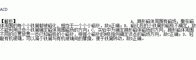 ͼÊÇÔÚÑо¿ÌãÐδÅÌåÖÜΧ´Å³¡·Ö²¼ºÍ·½ÏòµÄʵÑéÖУ¬½«ÌãÐδÅÌåÉÏÃæ·ÅÒ»¿éÓлú²£Á§£¬²£Á§ÉÏÈöÒ»²ãÌúм¡£ÇáÇáÇôò²£Á§£¬¿ÉÒÔ¿´µ½Ð¡ÌúмÓйæÔòµÄÅÅÁÐÆðÀ´£¬¹ØÓÚ¸ÃʵÑéµÄ¹ý³Ì£¬ÏÂÁÐ˵·¨ÖÐÕýÈ·µÄÊÇ