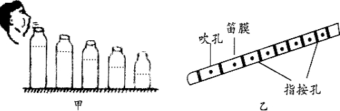 例如:(1)向瓶内吹气时,瓶内空气柱会振动而发声,由于每个瓶子的空气柱长短不一样,因而振动频率也不同,所以音调也会不同,笛子发声也是同样的道理.