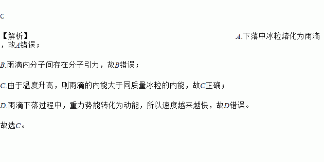 C 【解析】A.下落中冰粒熔化为雨滴,故A错误; B.雨滴内分子间存在分子引力,故B错误; C.由于温度升高,则雨滴的内能大于同质量冰粒的内能,故C正确; D.雨滴下落过程中,重力势能转化为动能,所以速度越来越快,故D错误。 故选C。