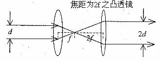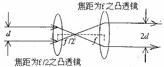(2011上海第25界初中物理竞赛复赛)在做光学实验时,某同学需要将一束平行光的宽度放大为2倍,于是他在光束路径中放置了由两片透镜组成的透镜组来到达此目的,如图所示。若其中一片透镜是焦距f的凸透镜,则:
