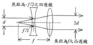 (2).放置一个-f/2的凹透镜,放置在第一片前f/2处。如图所示。