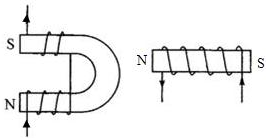 (2)根据安培定则反应的磁极和电流方向的关系,标出螺线管的磁极或者螺线管中导线的电流方向,如下图: