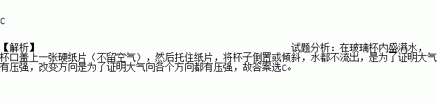 小明在玻璃杯内盛满水,杯口盖上一张硬纸片(不留空气),然后托住纸片,将杯子倒置或倾斜,水都不流出,纸片也不掉下(如图所示)。对整个探究活动的分析正确的是:( )