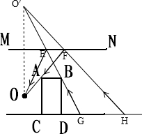 解答:解:①将O点看成是一个发光点.作O点在平面镜中的像O′,连接OA交MN于F,连接O′F交地面于H;连接O′B交MN于E,交地面于G,连接OE,标上箭头,光线传播方向如图所示.入射光线为HF、GE;反射光线为FO、EO.图中GH所围区域就是眼睛位于O点从平面镜MN中所能看到障碍物后方地面的范围.