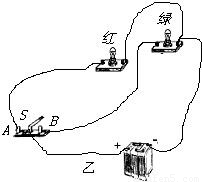 【答案】分析:从图中可以看出,红灯和绿灯并联,开关为单刀双掷开关,控制干路,S接A时红灯亮,接B时绿灯亮.