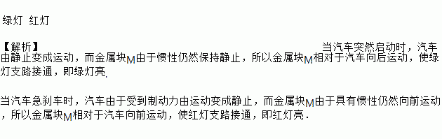 有一仪器中的电路如图所示,其中带金属细杆的金属滑块M与两侧金属弹簧相连接并接入电路中,金属块M与弹簧套在光滑绝缘水平细杆上。现将该仪器固定在一辆汽车上,当汽车启动时,____亮(选填“红灯”或“绿灯”);当汽车急刹车时,____亮(选填“红灯”或“绿灯”)。