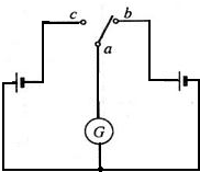 下图中K是一个单刀双掷开关,刀扳到右边时a、b两接线柱连通,刀扳到左边时,a、c两个接线柱连通.图中标有G的是电动机的符号.请把图中的这些符号连成电路图.使开关扳到左右两边时电动机各用一个电源供电,而且流过电动机的电流方向相反从而使其转动方向相反.