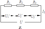 闭合开关S1,断开S2,三只电阻串联,电压表V1、V2仍然分别测量R1、R2两端电压,简化电路如图乙所示: