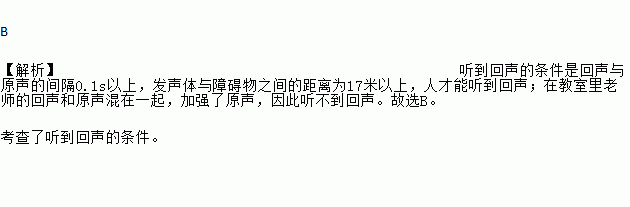 B 【解析】听到回声的条件是回声与原声的间隔0.1s以上,发声体与障碍物之间的距离为17米以上,人才能听到回声;在教室里老师的回声和原声混在一起,加强了原声,因此听不到回声。故选B。 考查了听到回声的条件。