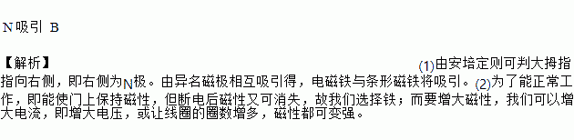 N ÎüÒý B ¡¾½âÎö¡¿(1)Óɰ²ÅඨÔò¿ÉÅдóÄ´Ö¸Ö¸ÏòÓҲ࣬¼´ÓÒ²àΪN¼«¡£ÓÉÒìÃû´Å¼«Ï໥ÎüÒýµÃ£¬µç´ÅÌúÓëÌõÐδÅÌú½«ÎüÒý¡£(2)ΪÁËÄÜÕý³£¹¤×÷£¬¼´ÄÜʹÃÅÉϱ£³Ö´ÅÐÔ£¬µ«¶Ïµçºó´ÅÐÔÓÖ¿ÉÏûʧ£¬¹ÊÎÒÃÇÑ¡ÔñÌú£»¶øÒªÔö´ó´ÅÐÔ£¬ÎÒÃÇ¿ÉÒÔÔö´óµçÁ÷£¬¼´Ôö´óµçѹ£¬»òÈÃÏßȦµÄȦÊýÔö¶à£¬´ÅÐÔ¶¼¿É±äÇ¿¡£
