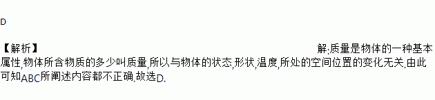 D 【解析】解:质量是物体的一种基本属性,物体所含物质的多少叫质量,所以与物体的状态,形状,温度,所处的空间位置的变化无关.由此可知ABC所阐述内容都不正确.故选D.
