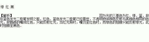 )”的三位发明者,在此前,红色、________色发光二极管己经面世,但直到发明了蓝色发光二极管后,利用发光二极管才能产生白色光源,当白光找到鹦鹉图片上时(如图),鹦鹉的嘴成红色,翅膀成绿色,若在暗室中,当________(选填某一单色光)光照时,嘴仍呈红色时,此时翅膀呈________色.