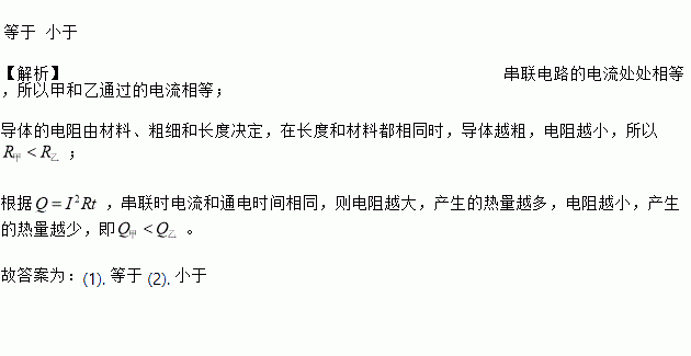 等于 小于 【解析】串联电路的电流处处相等,所以甲和乙通过的电流相等; 导体的电阻由材料、粗细和长度决定,在长度和材料都相同时,导体越粗,电阻越小,所以; 根据,串联时电流和通电时间相同,则电阻越大,产生的热量越多,电阻越小,产生的热量越少,即。 故答案为:(1). 等于 (2). 小于