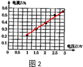 (3)闭合开关后,移动滑动变阻器的滑片,测得电压表与与电流表的示数如表所示,请在图2所示的直角坐标系上画出电流随电压变化的图象;