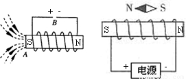 (2)因为同名磁极相互排斥、异名磁极相互吸引,所以通电螺线管的右端为N极,左端为S极.根据安培定则,伸出右手,使大拇指指向螺线管的N极,则四指弯曲的方向为电流的方向,即电流由螺线管的左端流入,电源的左端为正极,右端为负极,如图所示: