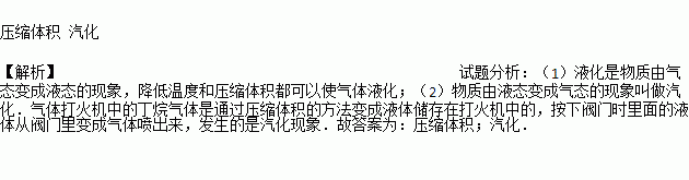 如图所示的气体打火机中的丁烷气体是通过 的方法变成液体储存在打火机中的,按下阀门使用时发生的物态变化是 。