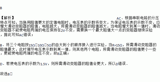 B 【解析】AC.根据串联电路的分压特点可知,当换用阻值更大的定值电阻时,电压表的示数将变大,为保证电压表的示数不变,应增大滑动变阻器的阻值,电阻越大,所需滑动变阻器的阻值越大,当电阻增大到某一值时,滑动变阻器不能使电阻两端的电压保持在2V不变,需要换一个最大阻值大一点的变阻器继续实验,据此可知AC错误; B.将三个电阻按15Ω、10Ω、5Ω的由大到小的顺序接入进行实验,当R=15Ω,...