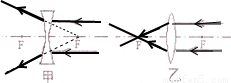 【答案】分析:仔细观察入射光线和折射光线的特点,根据凸透镜和凹透镜的三条特殊光线作图.