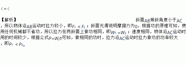 如图所示,将同一物体分别沿光滑的斜面AB.AC以相同的速度从底部匀速拉到顶点A,已知AB>AC,施加的力分别为F1、F2,拉力做的功为W1、W2,拉力做功的功率分别为P1、P2,则F1______F2,W1______W2,P1______P2。(选填“<”、“=”、“>”)