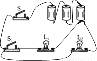 根据电路图连接实物电路图,从电源正极出发,先把开关S、S1、L1组成串联电路,回到电源负极,然后把灯L2并联在S1与L1串联电路两端,电路图如图所示.