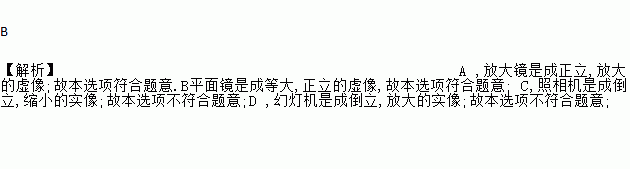 B 【解析】A ,放大镜是成正立,放大的虚像;故本选项符合题意.B平面镜是成等大,正立的虚像,故本选项符合题意; C,照相机是成倒立,缩小的实像;故本选项不符合题意;D ,幻灯机是成倒立,放大的实像;故本选项不符合题意;