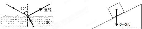 (1)请画出反射光线及折射光线的大致方向.(2)重8N的物体静止在斜面上,如图所示,请在图中作出重力的示意图.