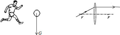 分析:(1)足球被运动员踢出后只受重力,所以实际上是作重力的示意图.(2)经过凸透镜焦点的光线经凸透镜折射后平行于主光轴.
