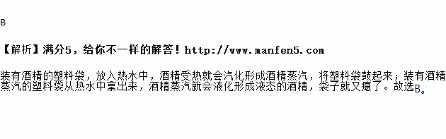 在透明塑料袋中滴入几滴酒精,将袋挤瘪,排尽袋中空气后把口扎紧,然后放入80℃以上的热水中。过一会儿,塑料袋鼓起;从热水中拿出塑料袋,过一会儿,塑料袋又瘪了,其原因分别是