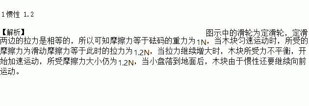 如图所示,在水平桌面的右端固定一定滑轮,轻质小盘通过一根绕过定滑轮的绳子与放在桌面上质量为0.4kg的木块相连.当小盘内放有重为1N砝码时,木块未被拉动,这时木块受到的摩擦力大小为_____ N;当小盘内放有重为1.2N的砝码时,木块正好做匀速运动;当小盘内放上重为1.5N砝码时,小盘拖动木块运动,在小盘落到地面后,木块由于______继续运动,此时木块所受的摩擦力大小为________N。