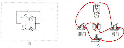 学校传达室有一只灯泡、一个电铃、一个电池组、两个开关及导线若干,要求前门来人时,闭合开关,铃响而灯不亮;后门来人时,闭合开关,灯亮而铃不响.请按要求在如图甲所示的虚线框中画出电路图,并根据电路图连接如图乙所示的实物元件.
