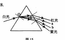 一束白光斜射到三棱镜上的O点,经折射后白光被分解为七种颜色的单色光,如图5所示(图中只标注了其中两种色光的光路)。请在图中从O点开始画出黄色光a和蓝色光b的大致光路。