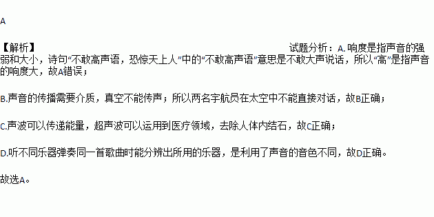 A. 诗句“不敢高声语,恐惊天上人”中的“高”是指声音的音调高