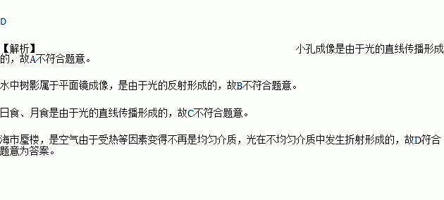 A. 小孔成像 B. 水中树影 C. 日食、月食 D. 海市蜃楼