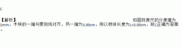 C 【解析】如图刻度尺的分度值为1mm,木块的一端与零刻线对齐,另一端为3.00cm,所以物体长度为L=3.00cm,故C正确为答案。